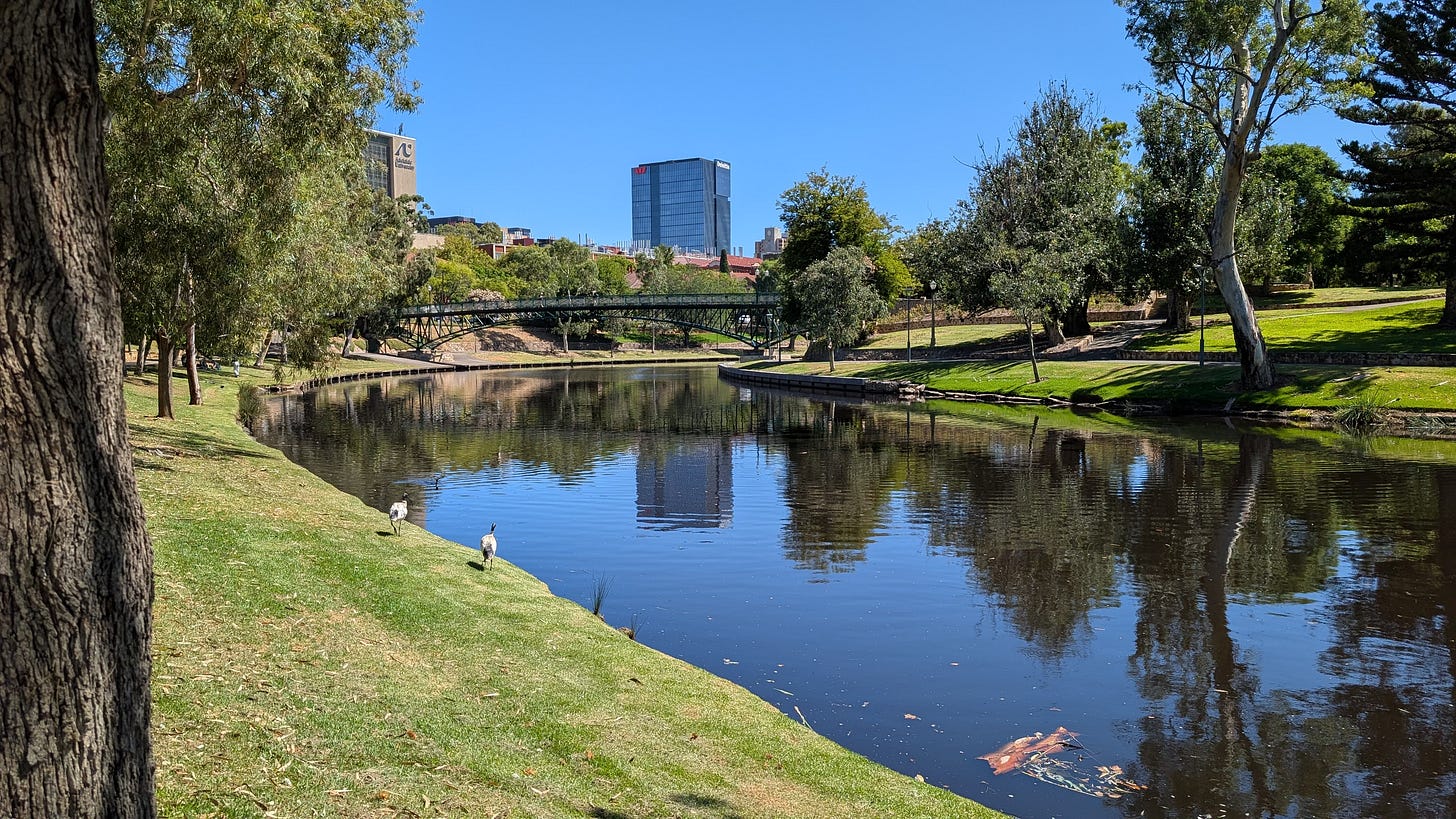 I spent a lot of my time in the South Australia State Library and Museum (which, on the Northern Terrace, are in one grand, endless building), which eventually become the grounds of The University of South Australia. The buildings are majestic and the grounds back onto one of the northern parks through which the River Torrens flows.